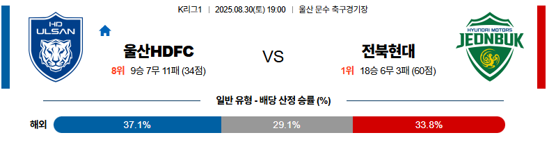 울산 대 전북 K리그1 08월30일 맞대결 생중계, 스포츠중계, 스포츠분석