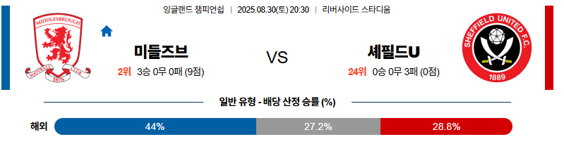 미들즈브러 대 셰필드유나이티드 잉글랜드챔피언쉽 08월30일 맞대결 생중계, 스포츠중계, 스포츠분석