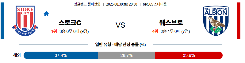 스토크시티 대 웨스트브로미치 잉글랜드챔피언쉽 08월30일 맞대결 생중계, 스포츠중계, 스포츠분석