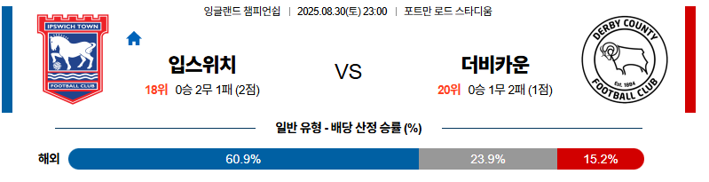 입스위치 대 더비카운티 잉글랜드챔피언쉽 08월30일 맞대결 생중계, 스포츠중계, 스포츠분석