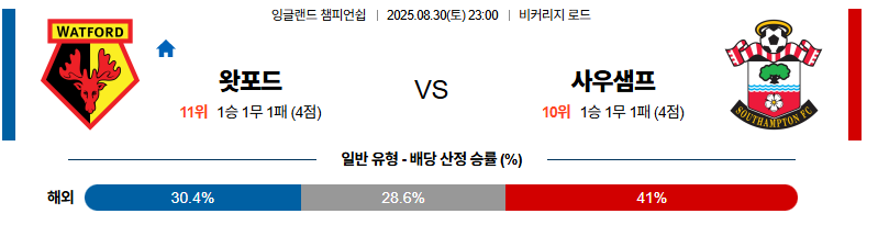 왓포드 대 사우샘프턴 잉글랜드챔피언쉽 08월30일 맞대결 생중계, 스포츠중계, 스포츠분석