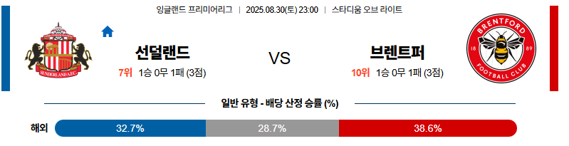 선덜랜드 대 브렌트퍼드 프리미어리그 08월30일 맞대결 생중계, 스포츠중계, 스포츠분석