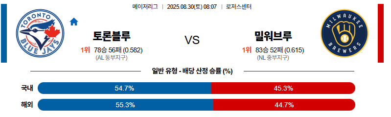 토론토 대 밀워키 MLB 08월30일 맞대결 생중계, 스포츠중계, 스포츠분석