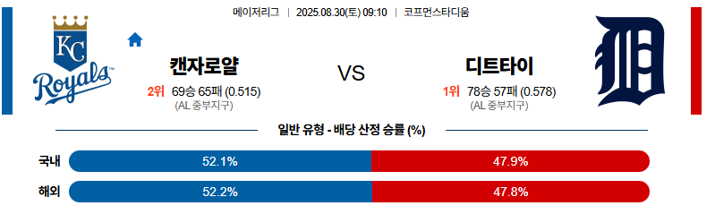 캔자스시티 대 디트로이트 MLB 08월30일 맞대결 생중계, 스포츠중계, 스포츠분석