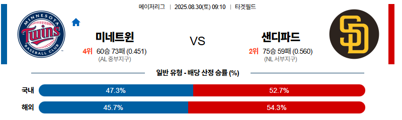 미네소타 대 샌디에이고 MLB 08월30일 맞대결 생중계, 스포츠중계, 스포츠분석