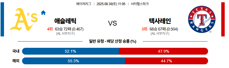 애슬레틱스 대 텍사스 MLB 08월30일 맞대결 생중계, 스포츠중계, 스포츠분석