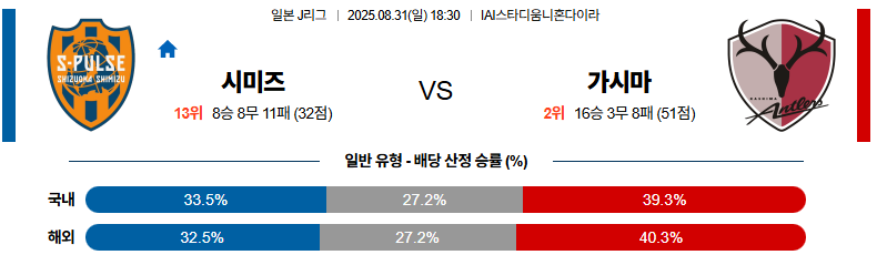시미즈 대 가시마 J리그1 08월31일 맞대결 생중계, 스포츠중계, 스포츠분석