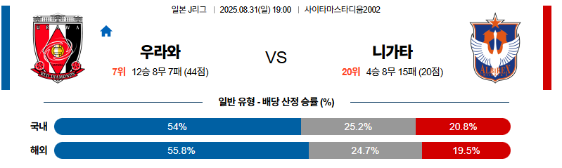 우라와 대 니가타 J리그1 08월31일 맞대결 생중계, 스포츠중계, 스포츠분석