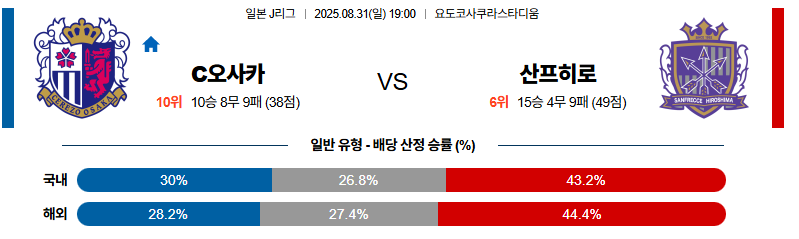 세레소오사카 대 산프레체히로시마 J리그1 08월31일 맞대결 생중계, 스포츠중계, 스포츠분석