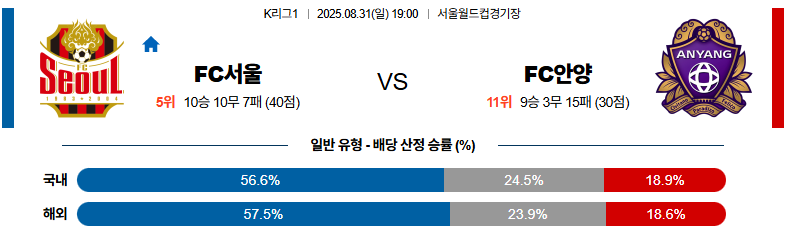 FC서울 대 안양 K리그1 08월31일 맞대결 생중계, 스포츠중계, 스포츠분석