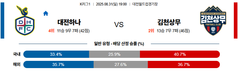 김천은 외국인 용병 없이도 조직력과 응집력을 바탕으로 상위권을 유지하는 팀입니다. 반대로 대전은 투자 대비 전술적 성과가 미흡하고, 경기 운영의 완성도 부족이 발목을 잡고 있습니다. 결국 이 경기는 김천이 전술적 우위와 응집력을 앞세워 승리를 챙길 가능성이 높습니다.