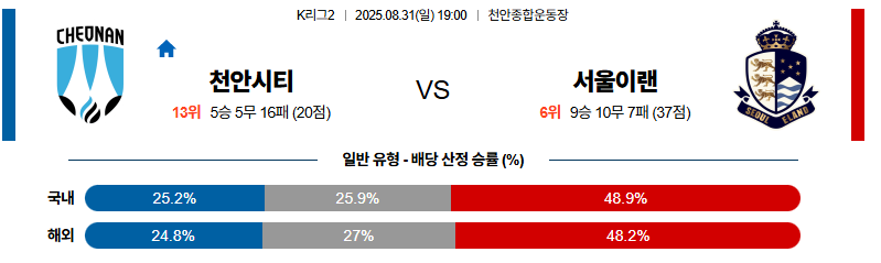 천안은 쓰리백 전술 특성상 측면에서 반복적으로 수적 불리 상황에 직면할 수 있습니다. 서울이랜드는 하프스페이스 침투와 측면 조합 플레이를 활용해 이 약점을 집중 공략할 것입니다. 결국 이번 맞대결은 전술적 상성과 숫자 싸움에서 우위를 점하는 서울이랜드가 승리를 가져갈 가능성이 높습니다.