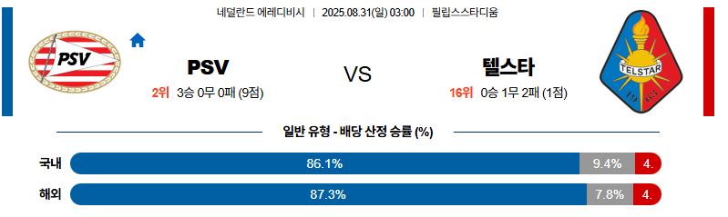 아인트호벤 대 텔스타 에레디비지 08월31일 맞대결 생중계, 스포츠중계, 스포츠분석