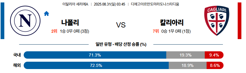 나폴리는 공격 전개와 전술 완성도에서 칼리아리를 압도할 수 있습니다. 칼리아리는 수비적으로 버티겠지만, 중원 압박과 전환 속도의 차이를 극복하기 어려울 것입니다. 결국 이 경기는 나폴리가 홈에서 강세를 이어가며 승리를 가져갈 가능성이 큽니다.
