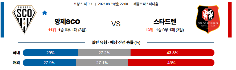 앙제 대 스타드렌 리그앙 08월31일 맞대결 생중계, 스포츠중계, 스포츠분석