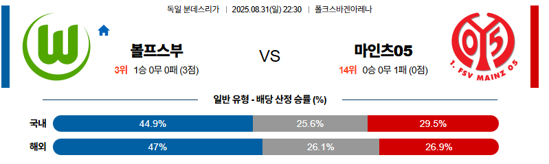 볼프스부르크 대 마인츠 분데스리가 08월31일 맞대결 생중계, 스포츠중계, 스포츠분석