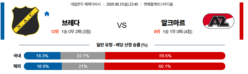 브레다 대 알크마르 에레디비지 08월31일 맞대결 생중계, 스포츠중계, 스포츠분석
