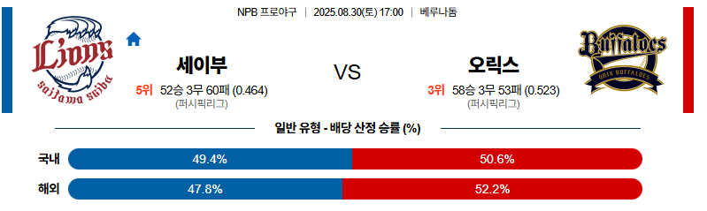 세이부 대 오릭스 NPB 08월30일 맞대결 생중계, 스포츠중계, 스포츠분석