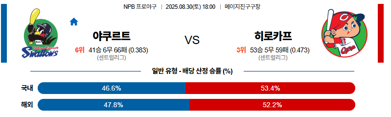 야쿠르트 대 히로시마 NPB 08월30일 맞대결 생중계, 스포츠중계, 스포츠분석