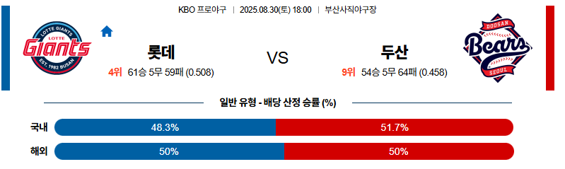 롯데 대 두산 KBO 08월30일 맞대결 생중계, 스포츠중계, 스포츠분석