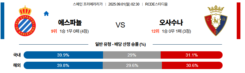에스파뇰 대 오사수나 라리가 09월01일 맞대결 생중계, 스포츠중계, 스포츠분석