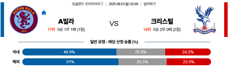 애스턴빌라 대 크리스탈팰리스 프리미어리그 09월01일 맞대결 생중계, 스포츠중계, 스포츠분석