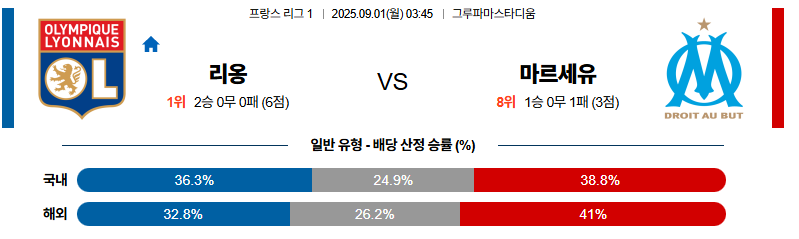 마르세유는 오바메양의 결정력, 그린우드의 폭발적인 돌파, 호이비에르의 안정적인 전개로 경기의 주도권을 잡을 수 있습니다. 리옹은 홈에서 저항하겠지만, 수비 간격 유지 실패와 후반 집중력 저하로 버티기는 쉽지 않을 것입니다. 결국 이 경기는 마르세유가 전술적 우위와 공격 루트를 활용해 승리를 가져갈 가능성이 높습니다.