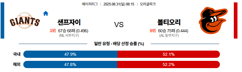 샌프란시스코 대 볼티모어 MLB 08월31일 맞대결 생중계, 스포츠중계, 스포츠분석