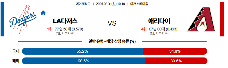 LA 다저스 승리로 베팅하시기를 추천드립니다. 언더 오버는 오버를 선택하는 것이 좋습니다.
