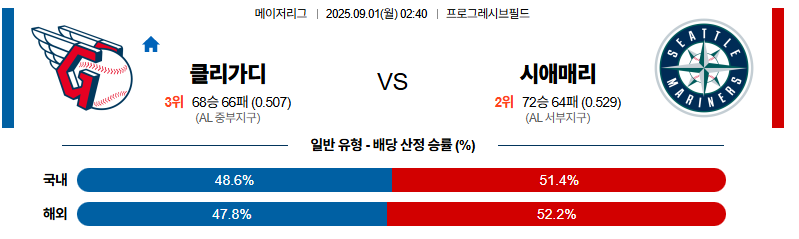 클리블랜드 대 시애틀 MLB 09월01일 맞대결 생중계, 스포츠중계, 스포츠분석