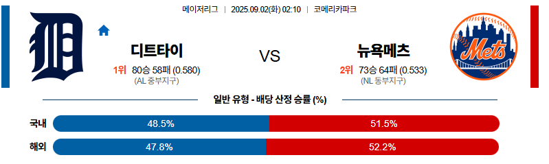 디트로이트 대 뉴욕메츠 MLB 09월02일 맞대결 생중계, 스포츠중계, 스포츠분석