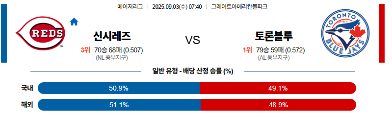 신시내티 대 토론토 MLB 09월03일 맞대결 생중계, 스포츠중계, 스포츠분석
