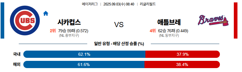 시카고컵스 대 애틀랜타 MLB 09월03일 맞대결 생중계, 스포츠중계, 스포츠분석