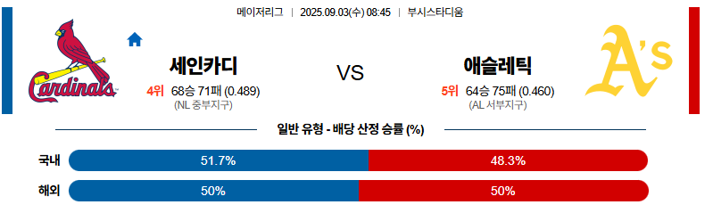 세인트루이스 대 애슬레틱스 MLB 09월03일 맞대결 생중계, 스포츠중계, 스포츠분석