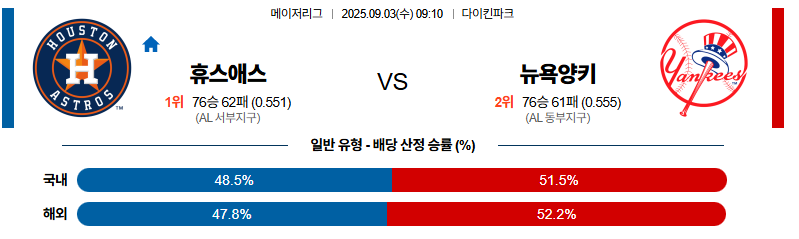 휴스턴 대 뉴욕양키스 MLB 09월03일 맞대결 생중계, 스포츠중계, 스포츠분석