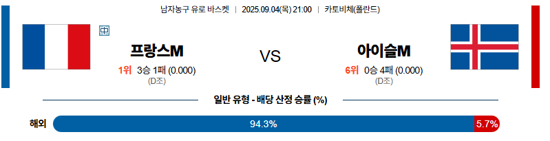프랑스 대 아이슬란드 유로바스켓 09월04일 맞대결 생중계, 스포츠중계, 스포츠분석