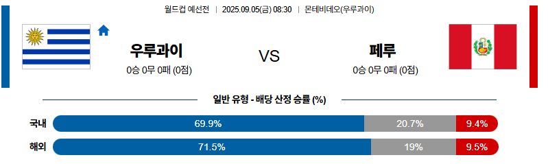 이 경기는 수비 블록을 기본으로 한 두 팀의 맞대결이어서, 공격 기회 자체가 제한될 가능성이 큽니다. 우루과이는 속공과 세트피스를 노리지만, 페루의 촘촘한 수비를 넘기엔 쉽지 않을 것입니다. 페루는 게레로를 앞세운 단순 전개 외에는 날카로움이 떨어집니다. 따라서 후반까지도 팽팽한 균형이 유지되며, 무승부로 귀결될 확률이 가장 높습니다.