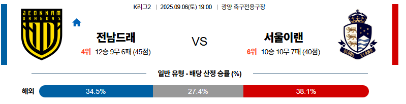 전남 대 서울이랜드 K리그2 09월06일 맞대결 생중계, 스포츠중계, 스포츠분석