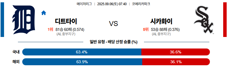 디트로이트 대 시카고W MLB 09월06일 맞대결 생중계, 스포츠중계, 스포츠분석
