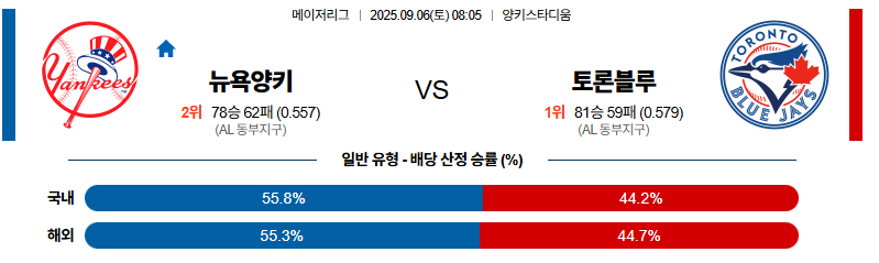 뉴욕양키스 대 토론토 MLB 09월06일 맞대결 생중계, 스포츠중계, 스포츠분석