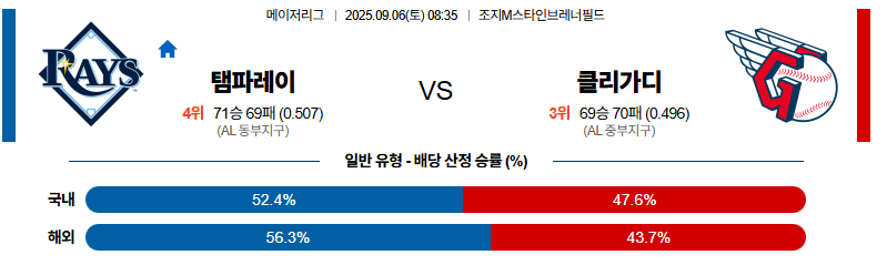 탬파베이 대 클리블랜드 MLB 09월06일 맞대결 생중계, 스포츠중계, 스포츠분석