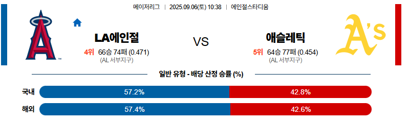 LA에인절스 대 애슬레틱스 MLB 09월06일 맞대결 생중계, 스포츠중계, 스포츠분석
