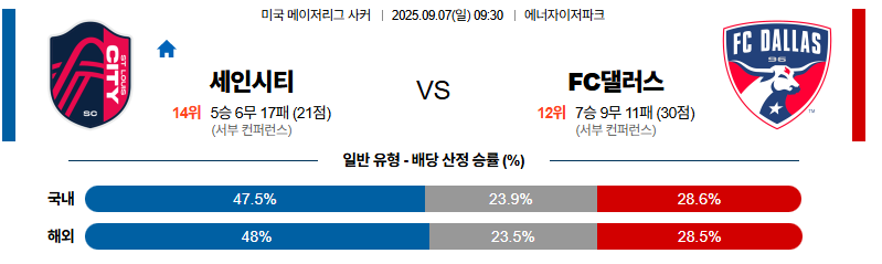 세인트루이스 대 댈러스 메이저리그사커 09월07일 맞대결 생중계, 스포츠중계, 스포츠분석