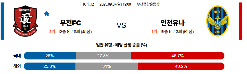 부천은 측면 공략에, 인천은 원투 패스라는 단일 루트에 지나치게 의존하고 있습니다. 서로의 공격 패턴이 단조로운 만큼 수비진이 대응하기 쉬워져 결정적인 장면은 줄어들 수밖에 없습니다. 후반 교체 카드 또한 경기 흐름을 극적으로 바꾸지 못할 것으로 보입니다. 따라서 이번 경기는 루즈한 흐름 속에서 무승부로 마무리될 가능성이 가장 큽니다.