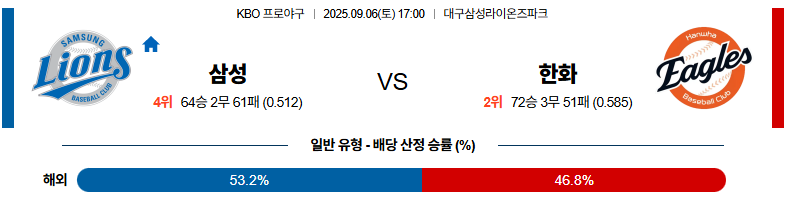 삼성 대 한화 KBO 09월06일 맞대결 생중계, 스포츠중계, 스포츠분석
