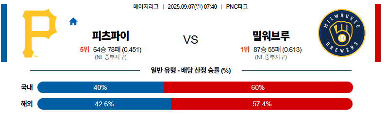 피츠버그 대 밀워키 MLB 09월07일 맞대결 생중계, 스포츠중계, 스포츠분석