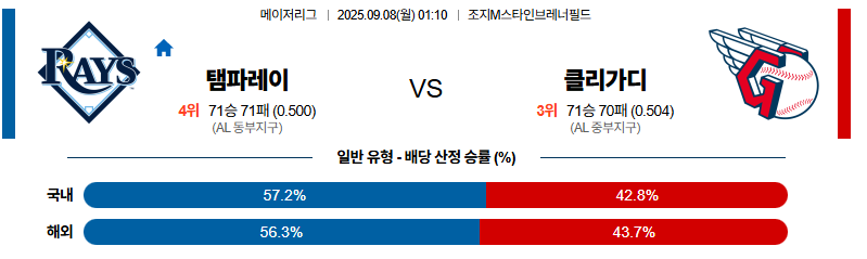 탬파베이 대 클리블랜드 MLB 09월08일 맞대결 생중계, 스포츠중계, 스포츠분석