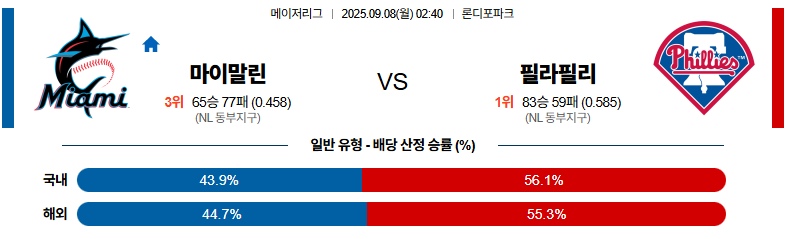마이애미 대 필라델피아 MLB 09월08일 맞대결 생중계, 스포츠중계, 스포츠분석
