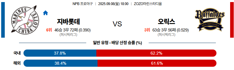 지바롯데 대 오릭스 NPB 09월08일 맞대결 생중계, 스포츠중계, 스포츠분석