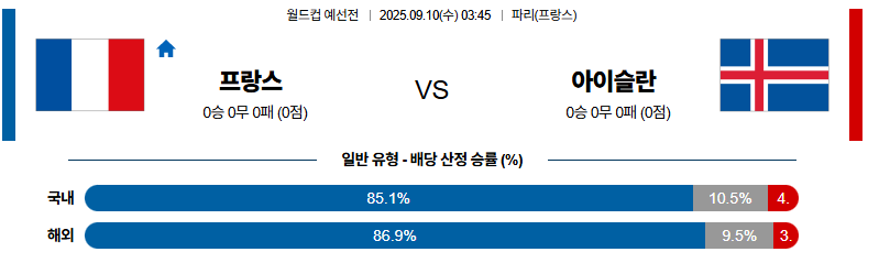 아이슬란드는 수비 간격과 빌드업 불안이라는 구조적 약점을 안고 있으며, 프랑스는 세트피스와 다양한 공격 루트를 통해 상대를 압박하며 경기 내내 주도권을 유지할 것입니다. 결국 프랑스가 여유 있게 승리를 완성할 것으로 예상됩니다.